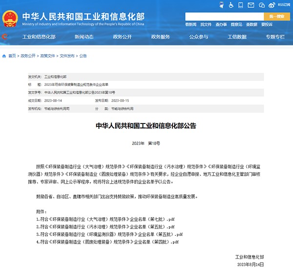 为贯彻落实《环保装备制造业高质量发展行动计划(2022-2025年)》,引导环保装备制造业高质量发展,促进行业技术创新,提升绿色发展水平,近日,国家工业和信息化部公示“2023年符合环保装备制造业规范条件企业名单”,在大气治理、污水治理、环境监测、固废处理等领域,全国总计59家企业入选。