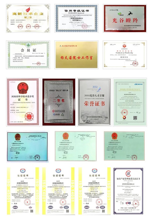 公司已通过ISO9001质量管理体系认证、“知识产权体系认证”、“环境管理体系认证”、“职业健康安全管理体系认证”,产品通过国家计量认证,连续四年入选东湖高新区“瞪羚企业”、连续两次通过国家高新技术企业认定、两次入选东湖高新区“3551光谷人才计划”、入选湖北省“企业创新积分百强榜单”,曾获得武汉市“科技小巨人”、“光谷高科技成长科技企业20强”、“武汉十佳创业第一名”、“创新型中小企业”、“专精特新”等荣誉。