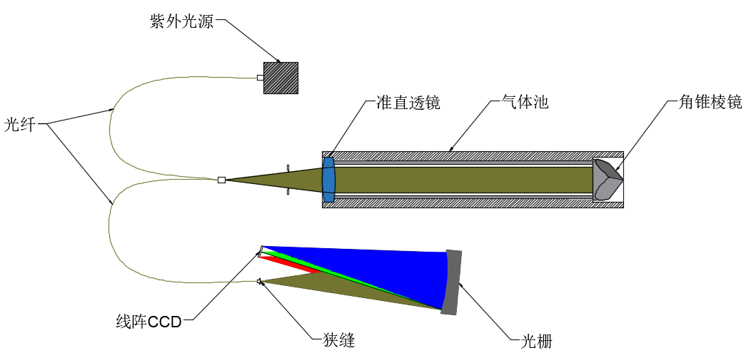 紫外光源发出的紫外光经准直透镜准之后进入气体池,经样气吸收后的紫外光通过聚焦透镜聚焦后耦合进光纤并传输到光谱仪中。经过光栅分光、CCD接收光信号进行光电转换,得到待测气体的紫外吸收光谱,通过对光谱进行差分分析,并结合化学计量学算法及科学的数学模型,可以得出相关气体成分的浓度。