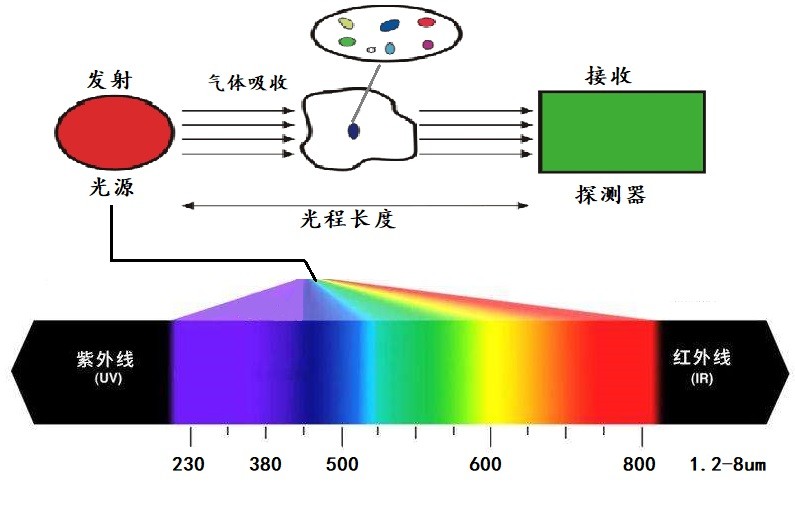 光谱仪可以扫描烷烃类的吸收峰1.2-1.8um附近的吸光度光谱吸收度,从来根据每种气体的指纹信息来区分气体类型,通过数学模型将样品吸光度对应不同组分浓度的吸光度曲线,每种曲线在不同波段的高度综合运算反映出实际对应的气体物质的真实浓度。