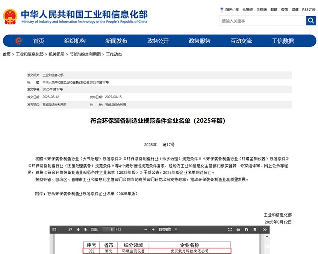 近日,国家工业和信息化部发布《符合环保装备制造业规范条件企业名单(2025年版)》,betway唯一官网凭借在“环境监测仪器”领域的扎实技术实力、规范的生产管理体系与持续的创新实践,成功通过专家评审与公示程序,入选国家工信部权威名单!