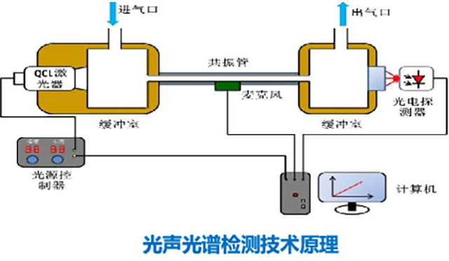 基于中红外量子级联激光光声光谱检测技术,运用中红外波段的高吸收系数特点,选择中红外量子级联激光器(QCL)作为光源,提高最低检测限和系统测量精度。当光声腔内样品受到一束调制后的单色光照射时,以无辐射弛豫方式将吸收的光能部分或全部地转换成热,样品受热体积膨胀,产生以光源为中心向外扩展的压力波,用置于其中的声波传感器便可接收到声音(光声)信号。