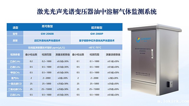 变压器油中溶解气体在线监测技术是实施主变压器状态监测的重要手段,其技术关键是根据光谱技术分析油中特征气体成分的变化,根据监测结果来分析判断电力变压器内部的异常和故障发展趋势,以保证电力变压器的安全可靠运行。GW-2060型激光光声光谱变压器油中气体监测预警装置是基于先进的中红外量子级联激光光声光谱技术面向国家电网及能源安全研制的高可靠性变压器油中溶解气体检测系统,可实现变压器油中溶解的H2CO、CO2CH4C2H2C2H4C2H6等故障气体及微水含量的连续在线检测,为变压器提供全面的实时监测预警。